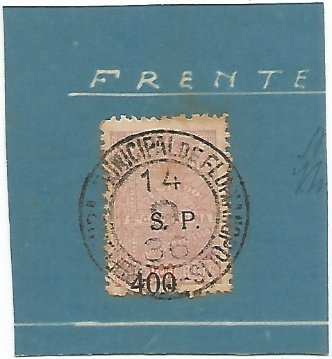 | 74239 | Brasil, 1936, fragmento com selo fiscal do Estado de Santa Catarina Imposto do Selo 200 Réis (emissão de 1892) com sobrestampa "S.P. 400" (Saúde Pública 400 Réis) | 5,00 | Foto |