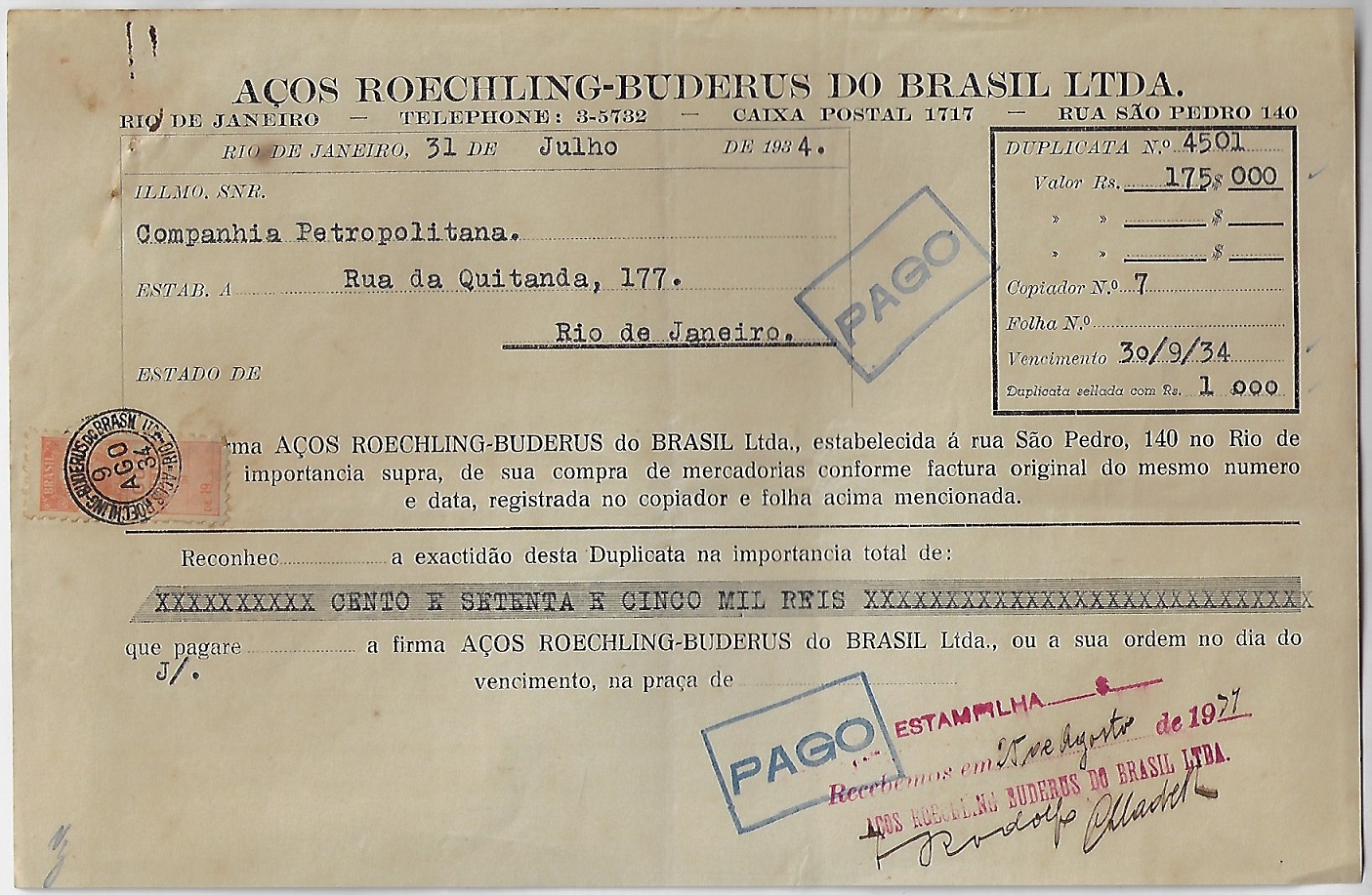 | 74596 | Brasil, 1934, Duplicata da Aços Roechling-Buderus do Brasil Ltda, do Rio de Janeiro, selo fiscal do Tesouro Nacional 1.000 Réis | 10,00 | Foto |