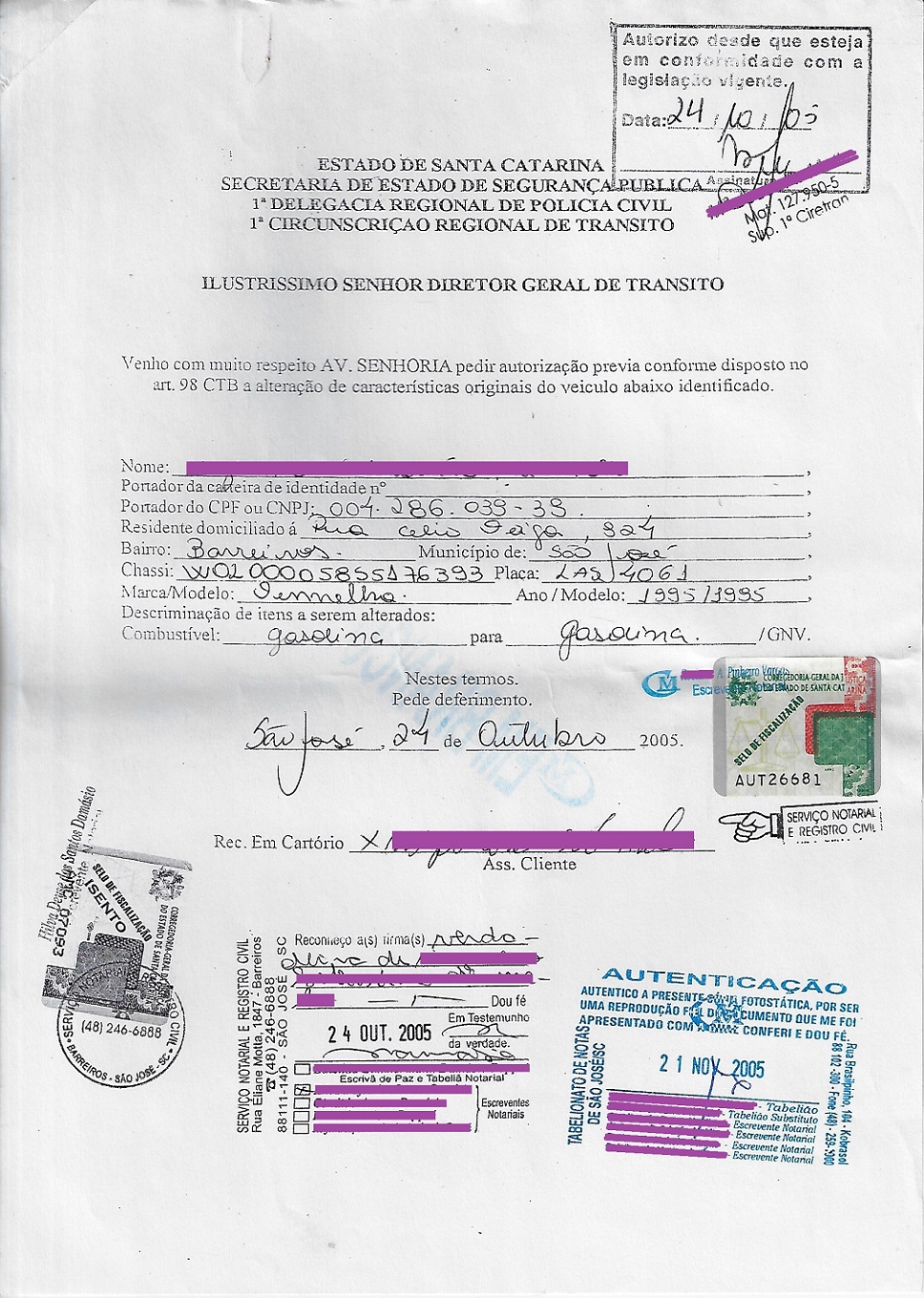 | 75279 | Brasil, 2005, cópia de documento com Selo de Fiscalização do Estado de Santa Catarina, sem sobrecarga "Isento" | 10,00 | Foto |