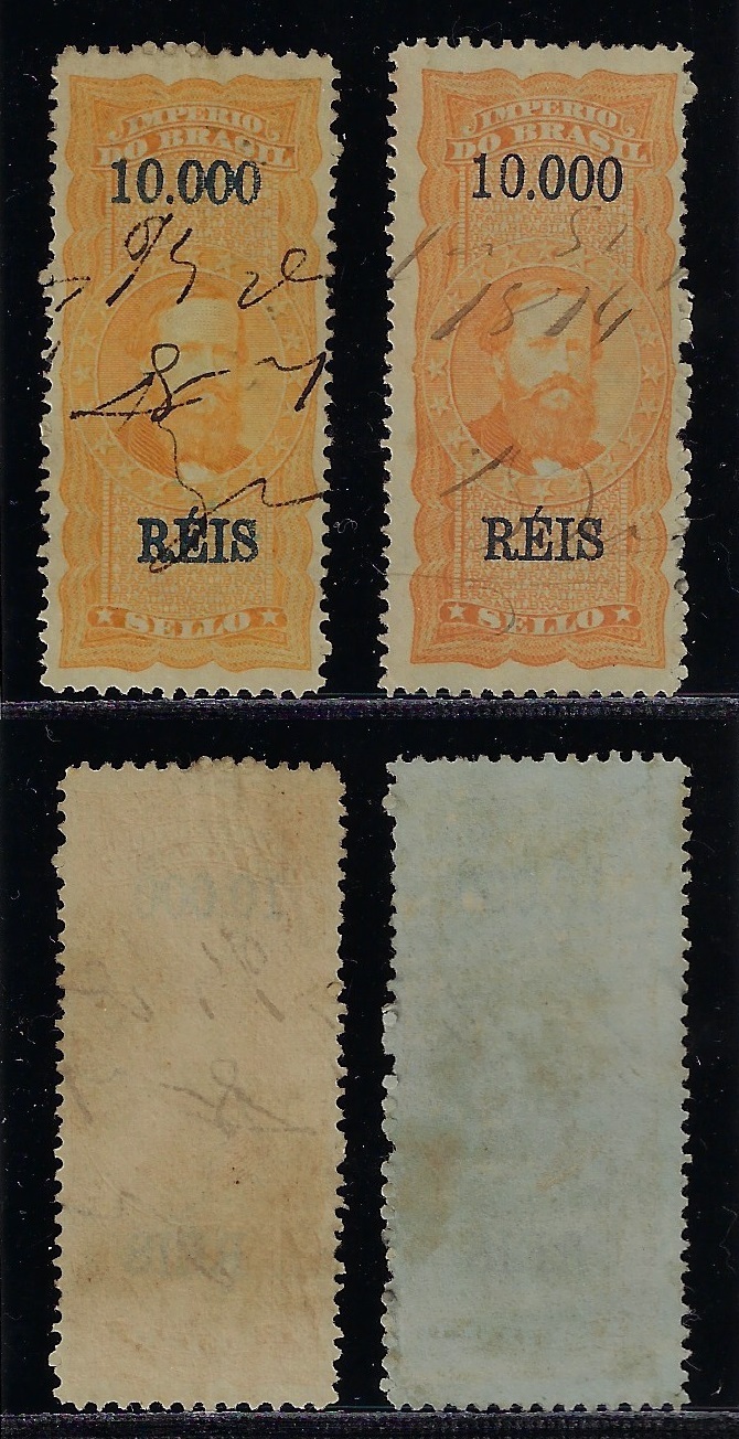 | 75306 | Brasil, 1869, selo fiscal 10$, com ponto, papel branco e papel com manchas azuis, obliterados a pena | 20,00 | Foto |