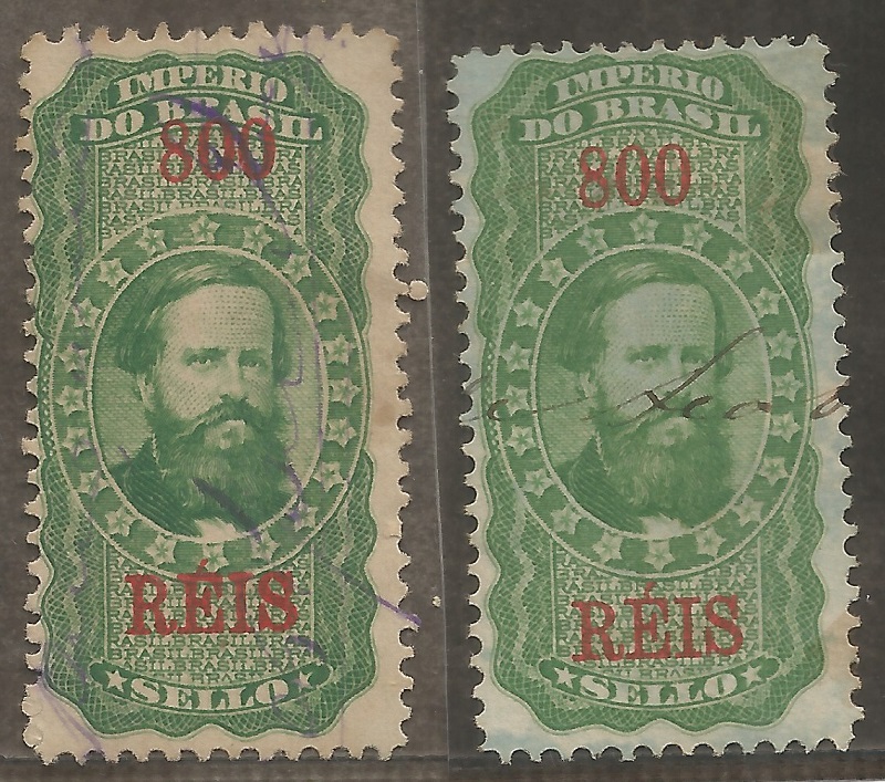 | 75310 | Brasil, 1869, selo fiscal 800 Réis, papel branco e papel com manchas azuis, obliterados a pena | 10,00 | Foto |