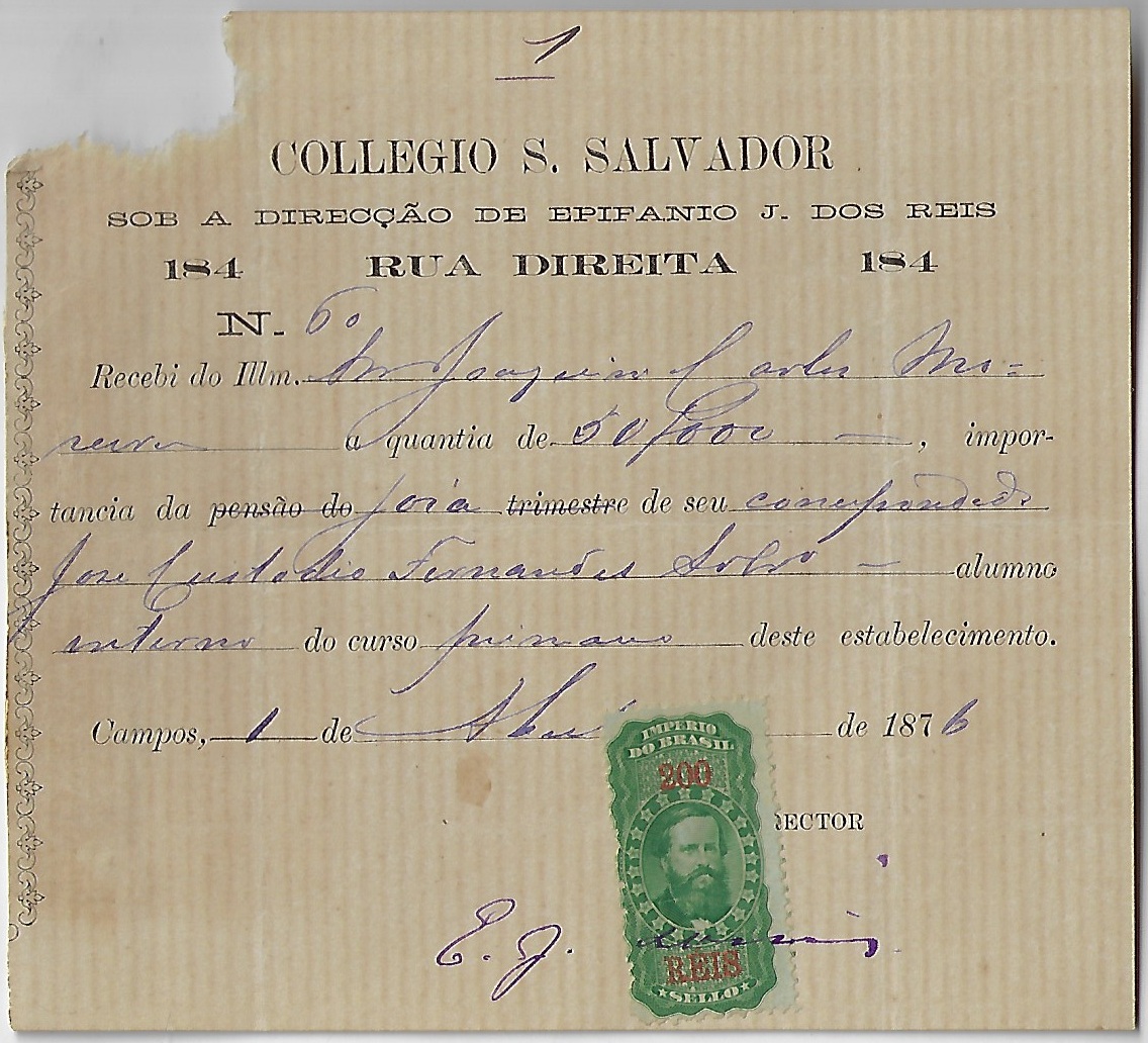 | 46125 | Brasil, 1879, Recibo do Internato São João Batista, em Campos dos Goytacazes, selo fiscal D. Pedro II 200 Réis | 15,00 | Foto |