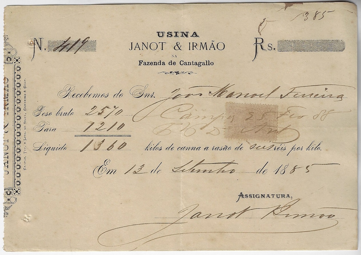 | 75433 | Brasil, 1885, recibo da Usina Janot & Irmão, em Campos / RJ, selo fiscal 200 Réis (Cifra Cheia) | 20,00 | Foto |
