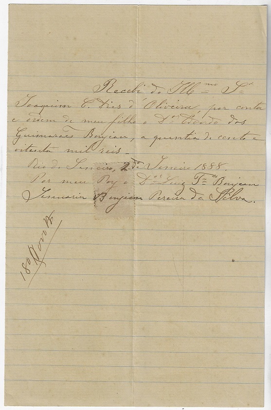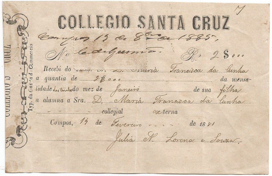 | 75436 | Brasil, 1881, recibo do Colégio Santa Cruz, em Campos / RJ, selo fiscal 200 Réis (D. Pedro II) | 15,00 | Foto |