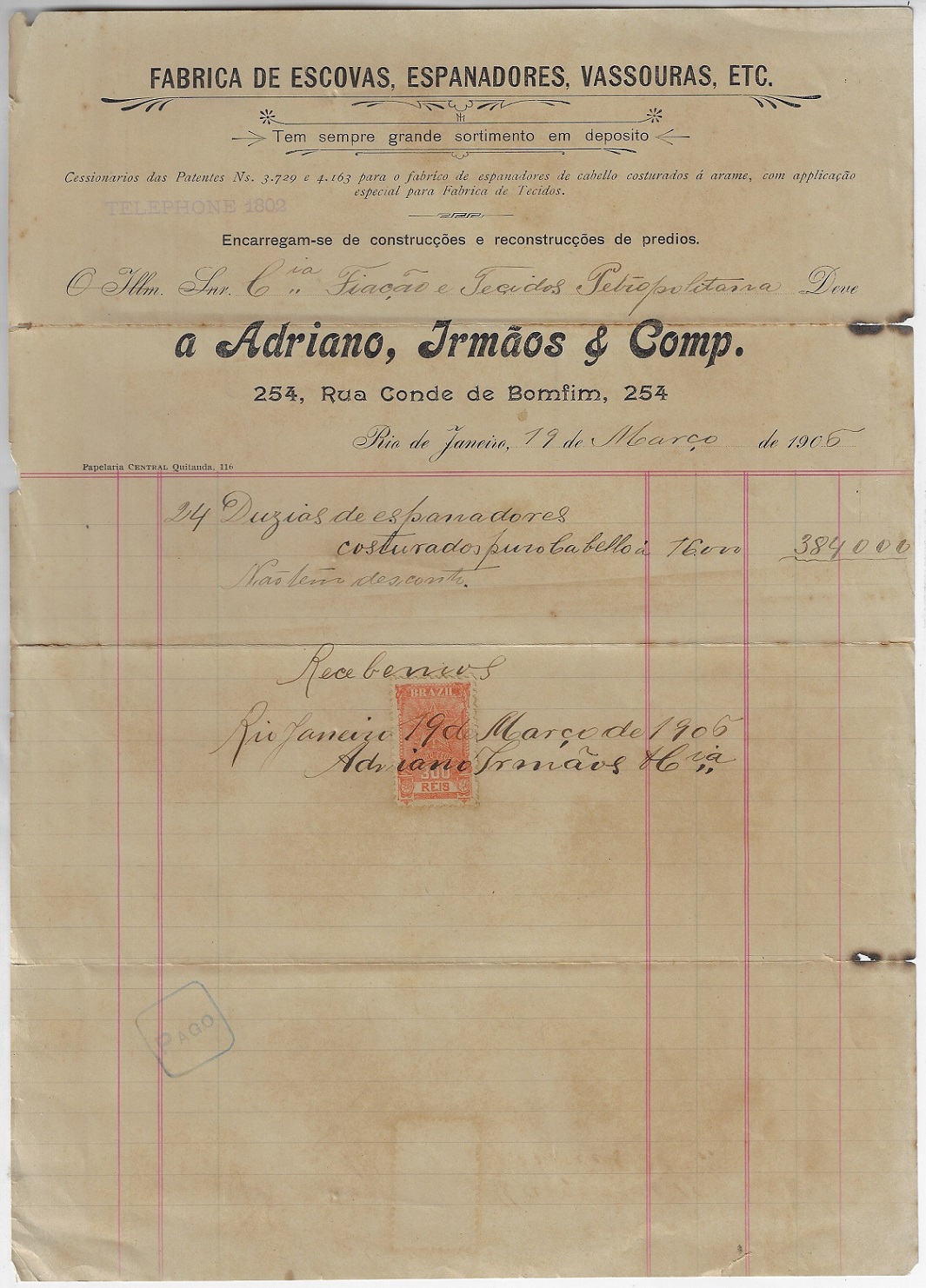 | 76096 | Brasil, 1906, nota fiscal da Fábrida de Escovas, Espanadores, Vassouras, etc. de Adriano, Irmãos & Companhia, emitida no Rio de Janeiro, selo fiscal do Tesouro Federal 300 Réis | 10,00 | Foto |
