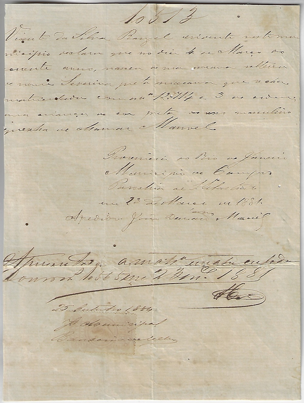 | 77189 | Brasil, 1881, recibo emitido em Campos com selo fiscal D. Pedro II 200 Réis, assinado em 1884 | 20,00 | Foto |