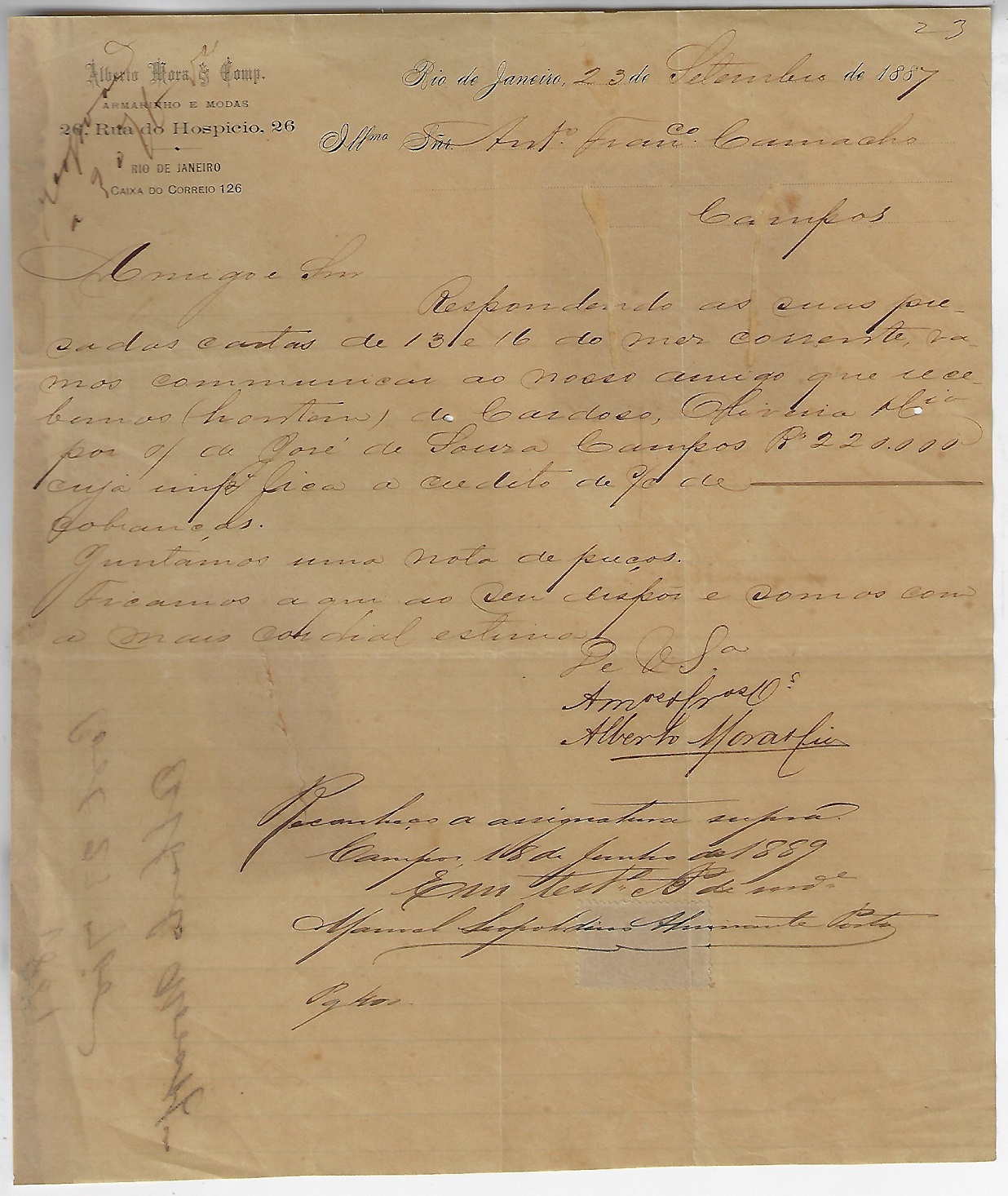 | 77314 | Brasil, 1887, documento timbrado do negociante de Armarinho e Modas Alberto Mora & Companhia com selo fiscal Cifra 200 Réis obliterado em Campos 1889 | 20,00 | Foto |