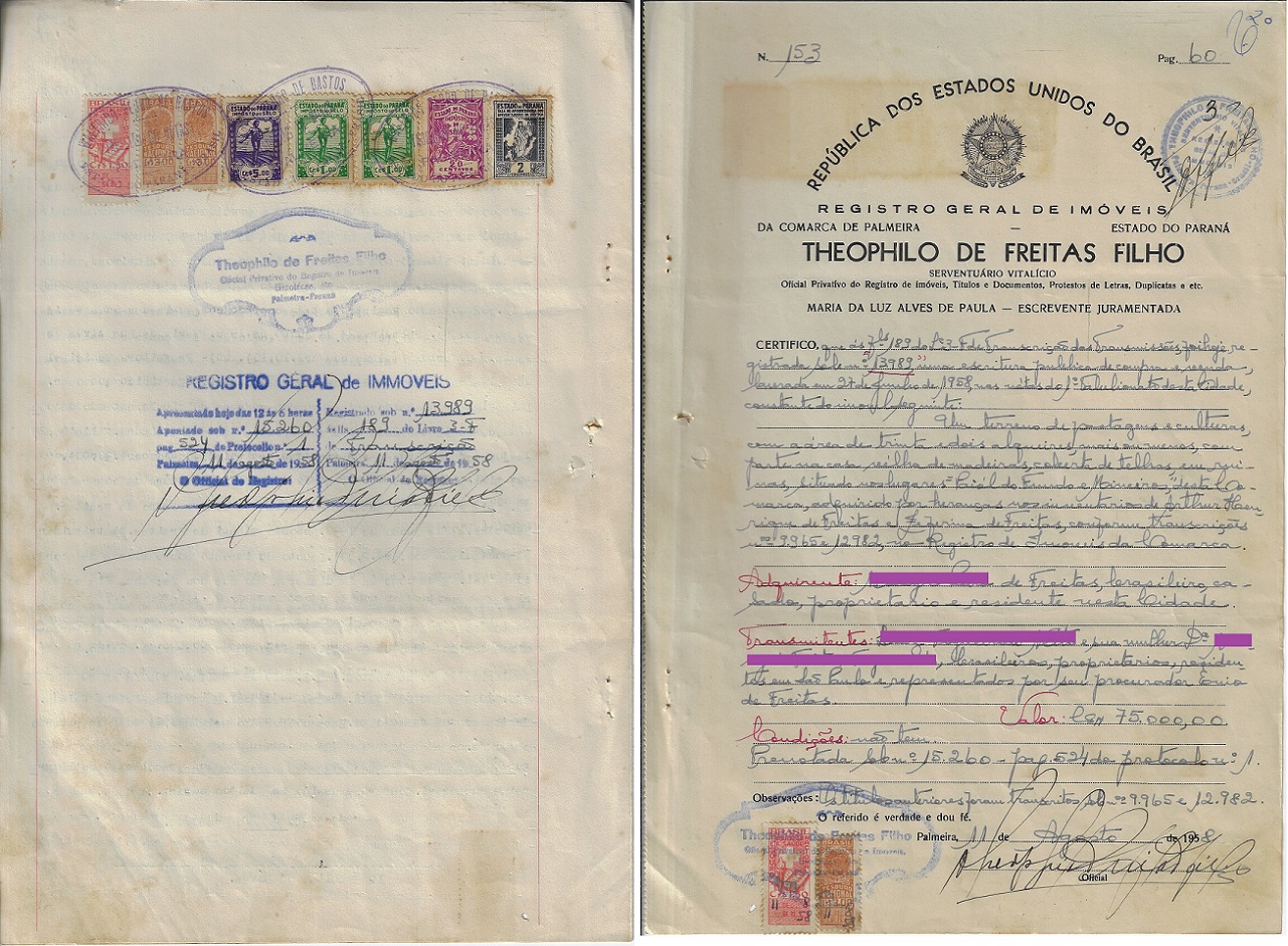 | 77468 | Brasil, 1958, escritura de compra e venda expedida em Palmeira / PR com 6 páginas + capa, com selos fiscais do Estado do Paraná 20 Centavos, 1(2), 2 e 5 Cruzeiros e selos fiscais do Tesouro Nacional 1,50(2) e 3(3) Cruzeiros | 15,00 | Foto |