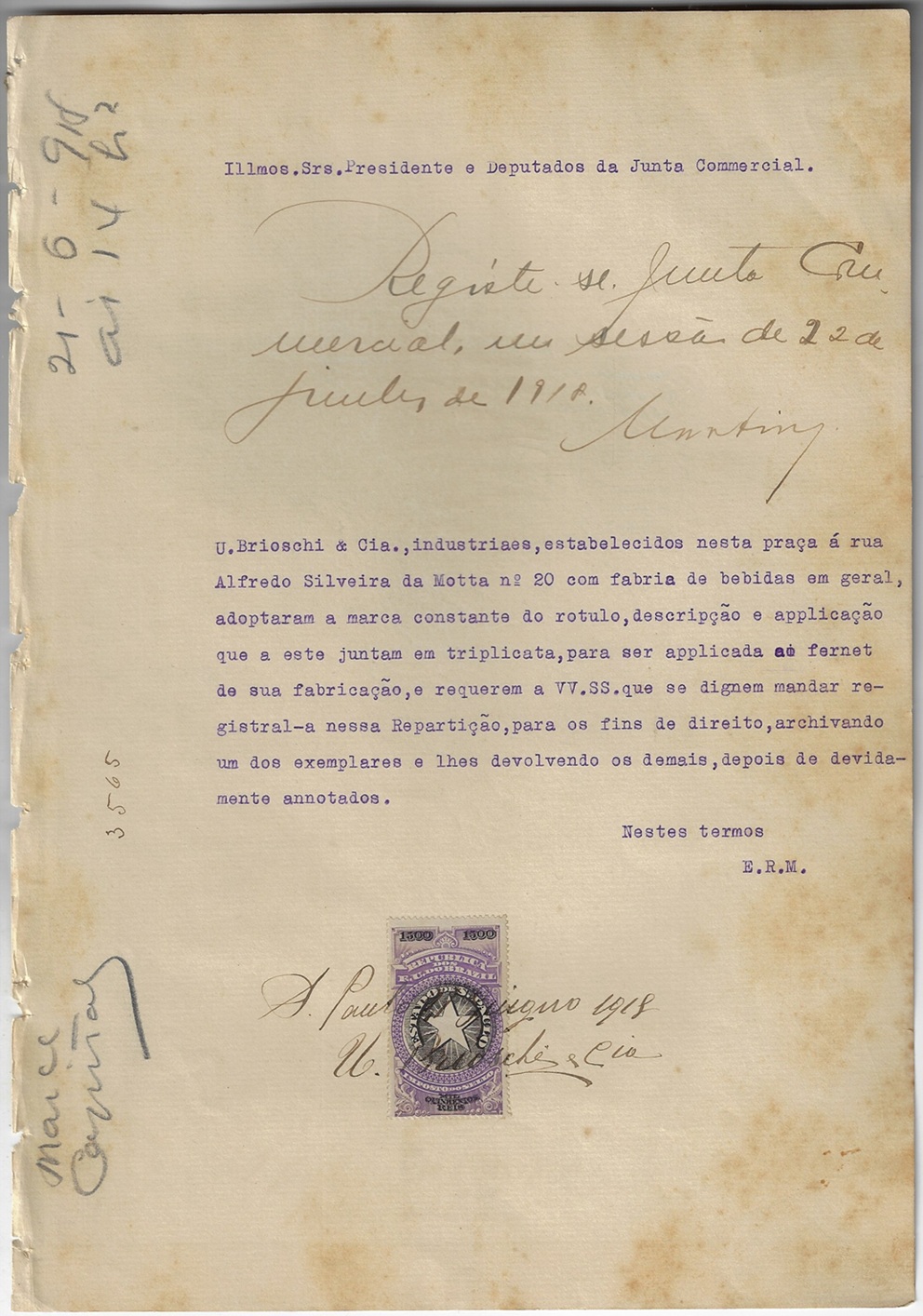 | 78319 | Brasil, 1918, documento de Registro de Marcas com selo fiscal do Estado de São Paulo 1.500 Réis, papel com marca d'água | 15,00 | Foto |