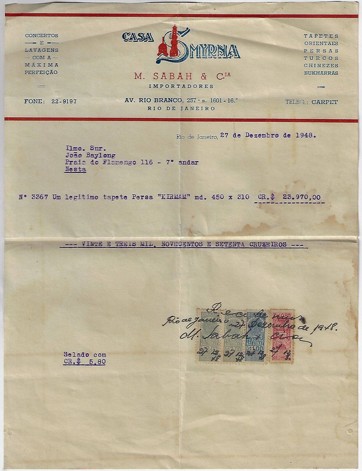 | 78559 | Brasil, 1948, nota fiscal da Casa Smyrna, de M. Sabah & Cia, emitida no Rio de Janeiro, selos fiscais do Tesouro Nacional Cr$0,80, Cr$1 e Cr$2x2 | 10,00 | Foto |