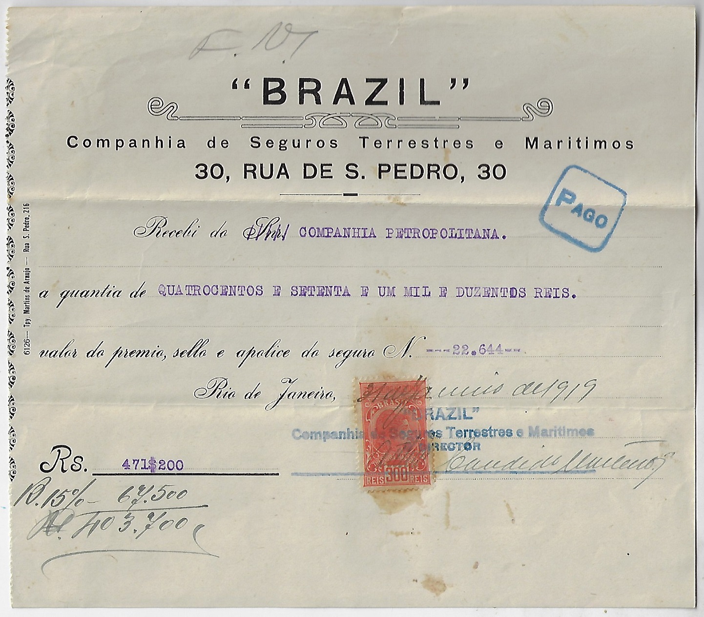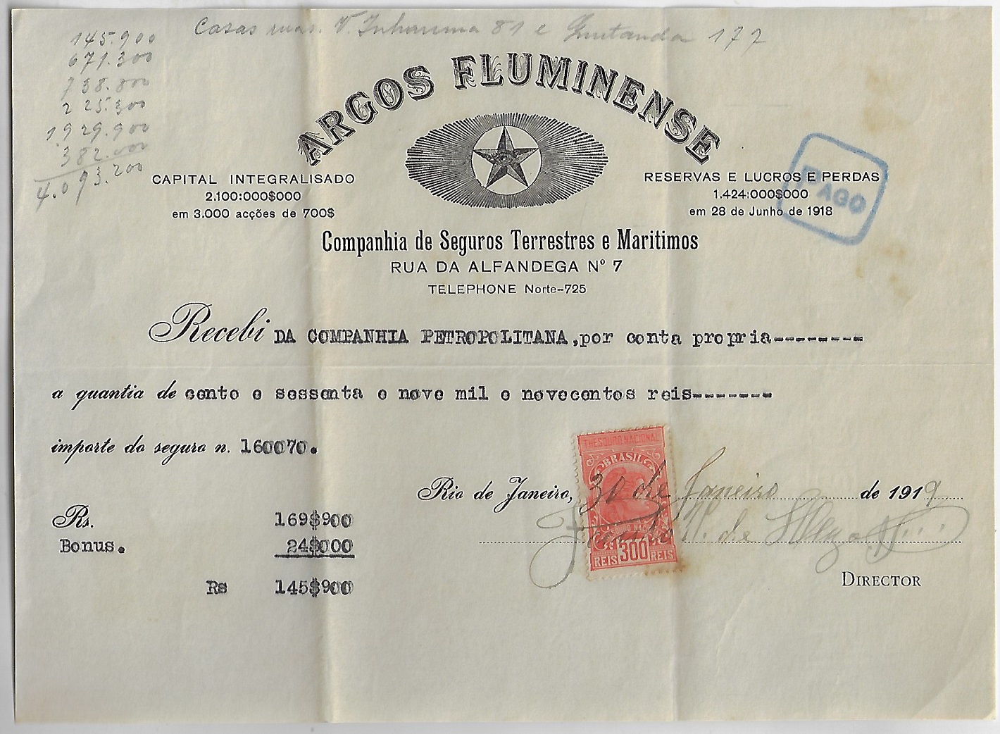 | 78672 | Brasil, 1919, recibo da Argos Fluminense, Companhia de Seguros Terrestres e Marítimos, do Rio de Janeiro, selo fiscal do Tesouro Nacional 300 Réis | 10,00 | Foto |