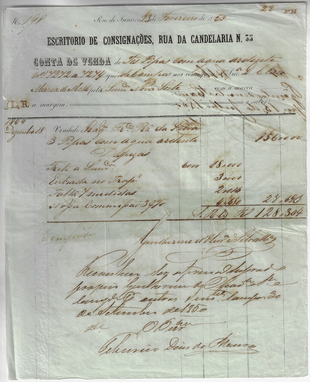 | 78874 | Brasil, 1850, conta de venda de "Pipas com água ardente" vindas de Campos e negociadas pelo Escritório de Consignações, localizado na Rua da Candelária, Rio de Janeiro, carga embarcada na sumaca Nova Sorte | 20,00 | Foto |