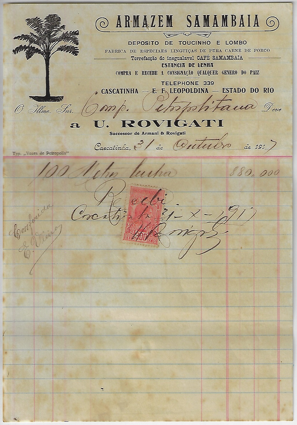 | 79742 | Brasil, 1917, nota fiscal do Armazém Samambaia para a Companhia Petropolitana, no Rio de Janeiro, selo fiscal do Tesouro Nacional 300 Réis | 10,00 | Foto |
