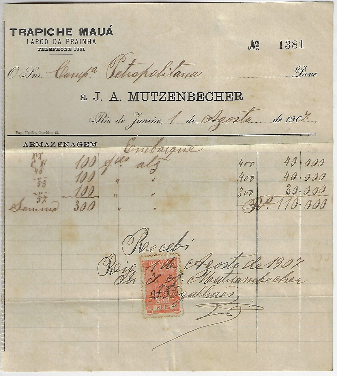 | 79794 | Brasil, 1907, nota fiscal do Trapiche Mauá, de J. A. Mutzenbecher, emitido no Rio de Janeiro, selo fiscal do Tesouro Nacional 300 Réis | 10,00 | Foto |