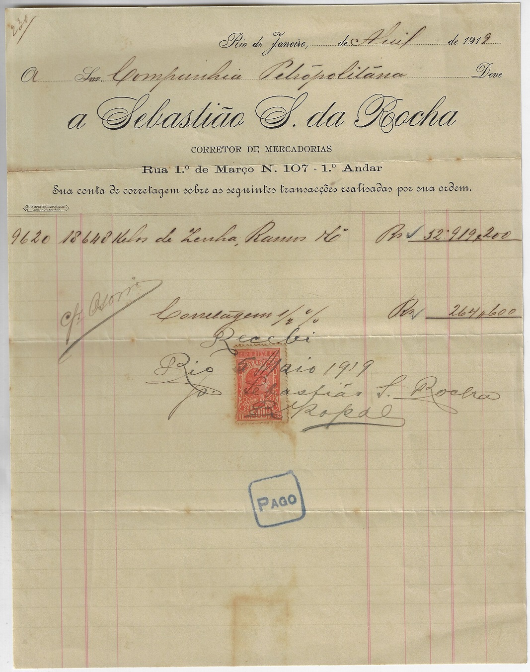 | 80198 | Brasil, 1919, nota fiscal do Corretor de Mercadorias Sebastião S. da Rocha, emitida no Rio de Janeiro, selo fiscal do Tesouro Nacional 300 Réis | 10,00 | Foto |