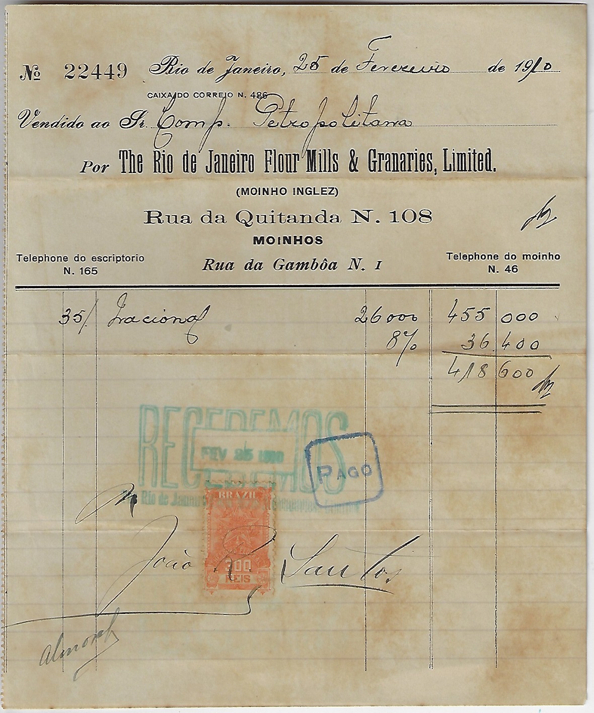 | 81476 | Brasil, 1910, nota fiscal da The Rio de Janeiro Flour Mills & Granaries Limited, selo fiscal do Tesouro Nacional 300 Réis | 10,00 | Foto |