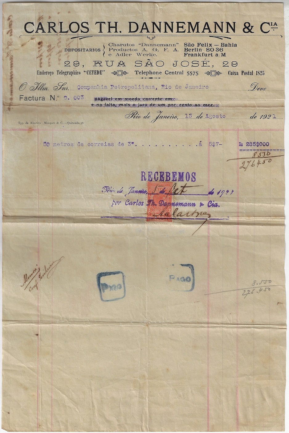 | 82344 | Brasil, 1921, nota fiscal de Carlos Th. Dannemann & Cia, emitida no Rio de Janeiro, selo fiscal do Tesouro Nacional 300 Réis | 10,00 | Foto |