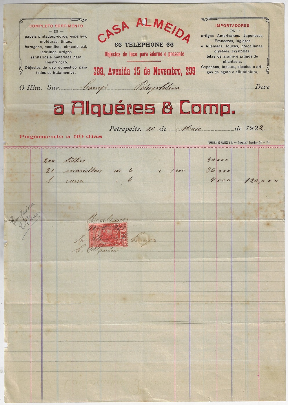 | 82393 | Brasil, 1922, nota fiscal da Casa Almeida, de Alquéres & Comp., emitida no Rio de Janeiro, selo fiscal do Tesouro Nacional 300 Réis | 10,00 | Foto |