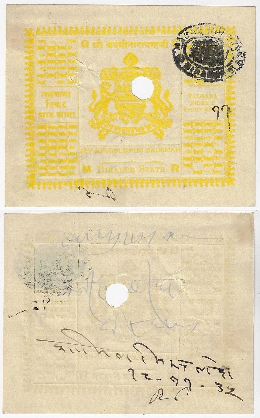 | 82528 | Índia / Bikaner, 1932, ticket na forma de inteiro fiscal no valor de 8 Annas, papel filigranado, perfuração de anulação | 20,00 | Foto |