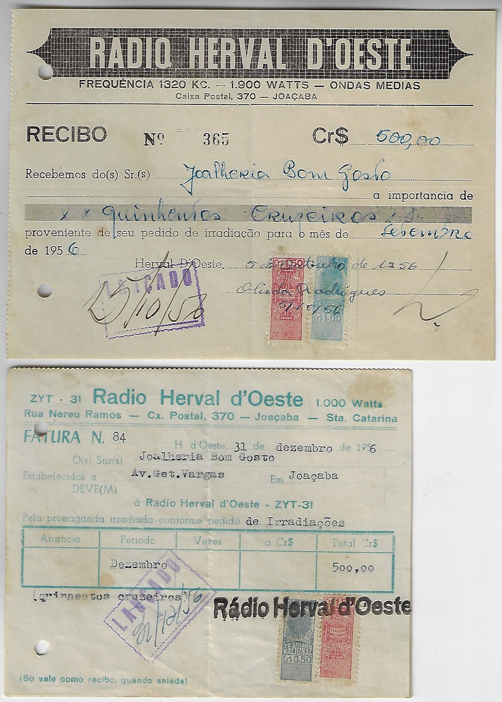 | 82624 | Brasil, 1956, 2 recibos da Rádio Herval do Oeste, então em Joaçaba, ambos com selos fiscais federais | 10,00 | Foto |