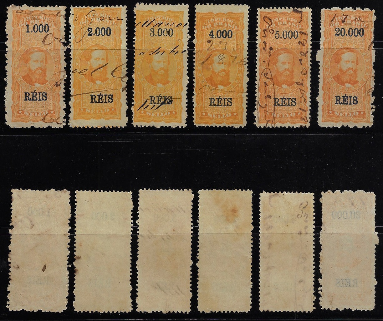 | 82630 | Brasil, 1869, selo fiscal D. Pedro II 1$, 2$, 3$, 4$, 5 e 20$, com ponto, papel branco, obliterados a pena | 60,00 | Foto |