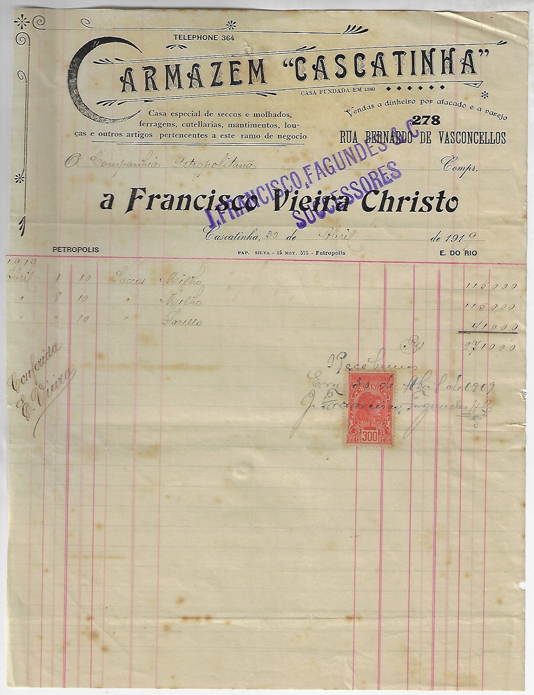 | 83380 | Brasil, 1919, nota fiscal da Armazém Cascatinha de J. Francisco, Fagundes & Cia, emitida em Petrópolis, selo fiscal 300 Réis do Tesouro Nacional | 10,00 | Foto |