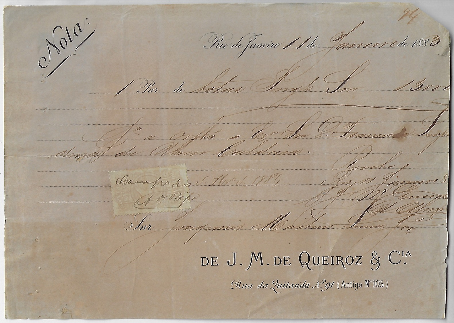 | 83658 | Brasil, 1883, nota fiscal de J. M. de Queiroz & Cia emitida no Rio de Janeiro, selo fiscal D. Pedro II 200 Réis | 20,00 | Foto |