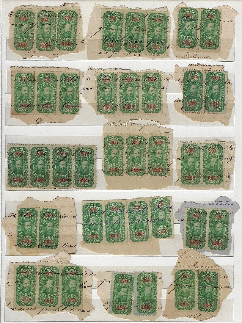 | 83910 | Brasil, 1867, conjunto de 40 selos sobre fragmento para estudo, todos retratando D. Pedro II 200 (maioria), 400 e 600 Réis, papel branco e com manchas azuis, denteado, percê e denteação mista | 60,00 | Foto |