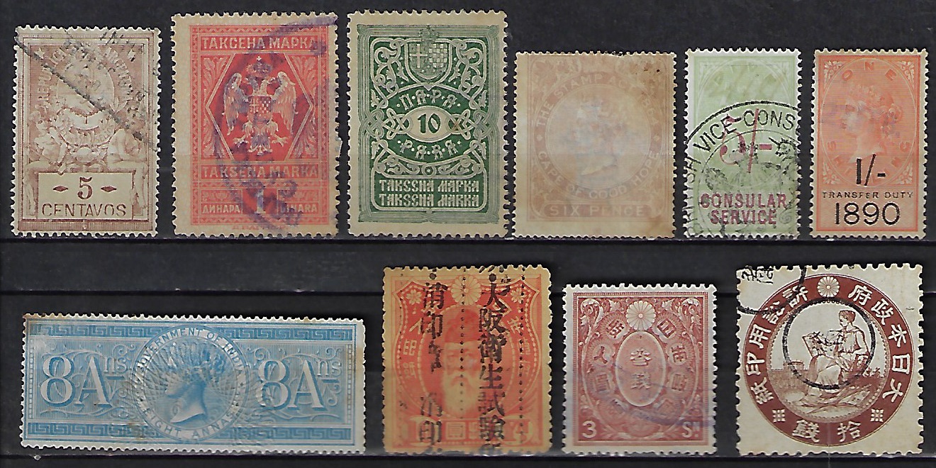 | 84101 | Argentina, Cabo da Boa Esperança, Croácia, Grã-Bretanha, Índia e Japão, 1890/1920s, 10 selos fiscais e consulares diferentes | 14,00 | Foto |