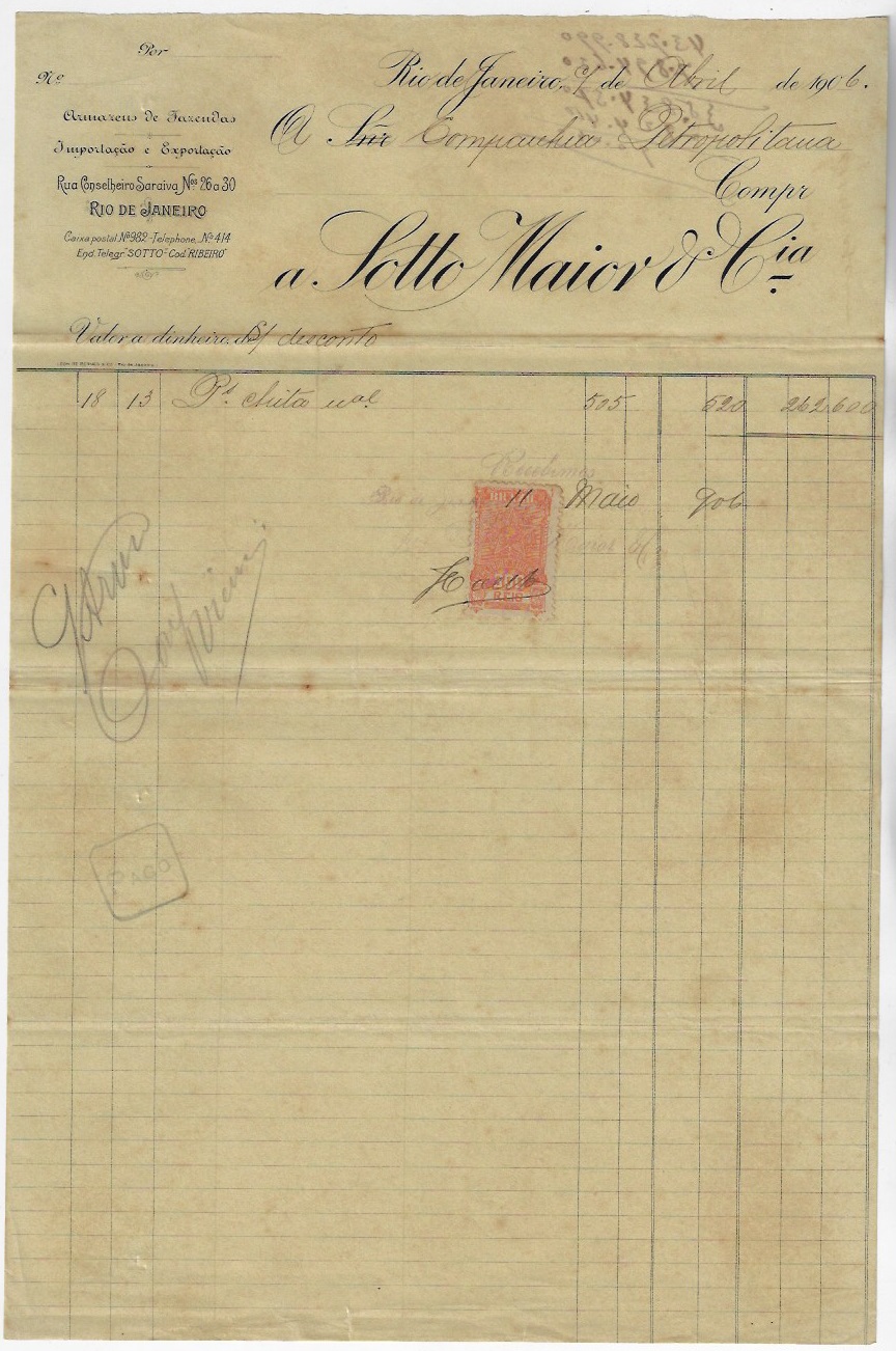 | 84498 | Brasil, 1906, nota fiscal de Sotto Maior & Companhia, do Rio de Janeiro, selo fiscal federal 300 Réis | 15,00 | Foto |