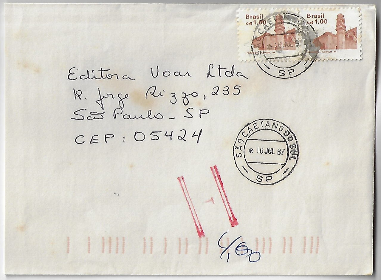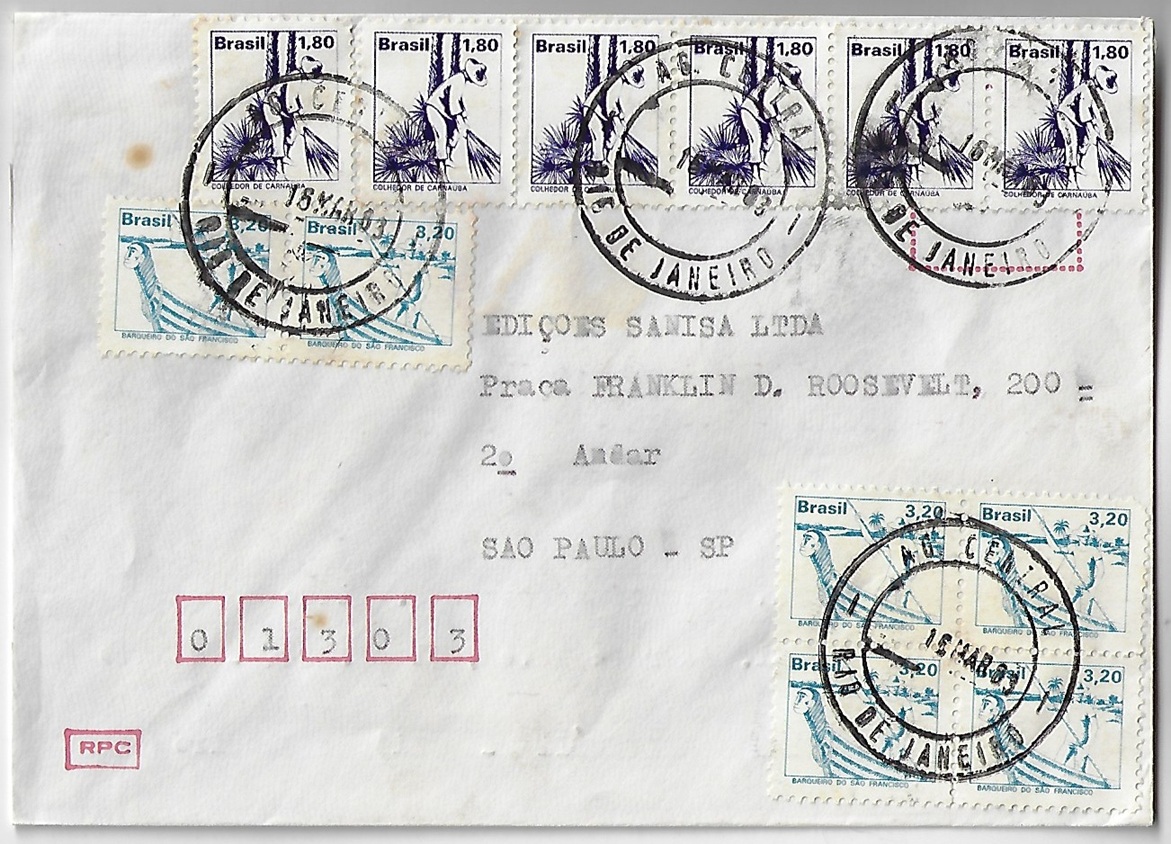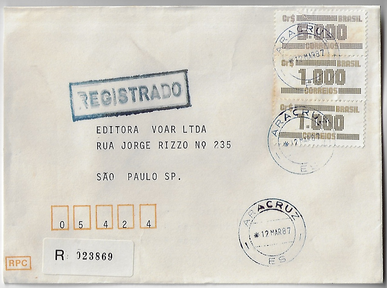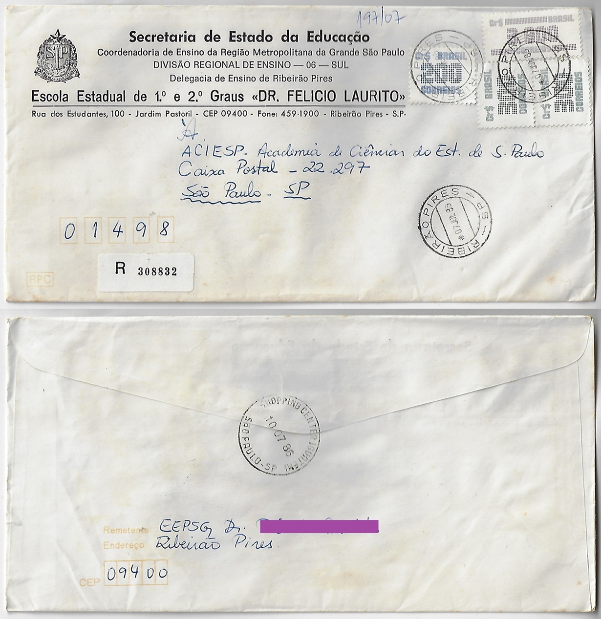 | 80884 | 2023, envelope prioritário registrado enviado de Biguaçu (21/11) para San Francisco / EUA, retornado ao remetente, marcas de triagem eletrônica na frente e no verso, 5 selos comemorativos 1ª Conferência Nacional da Juventure e 2 regulares Engraxate | 10,00 | Foto |