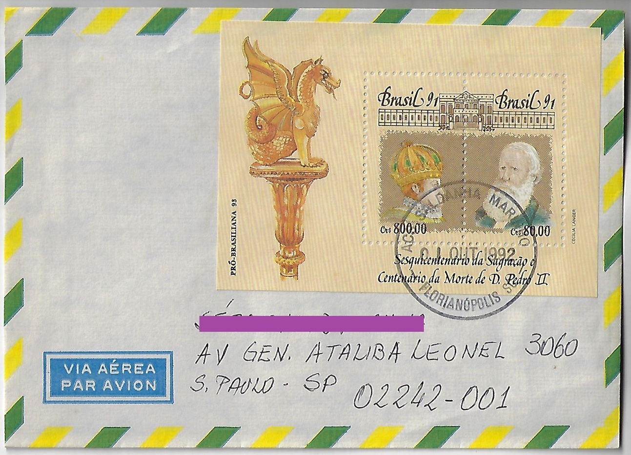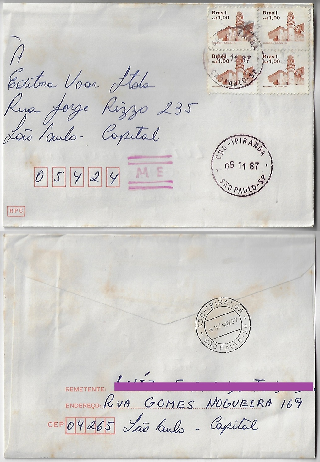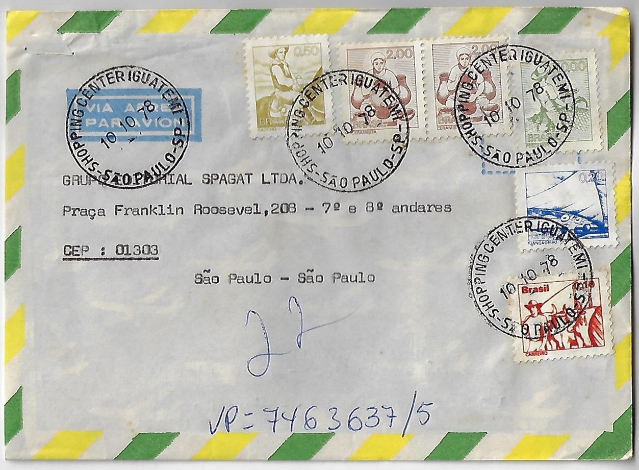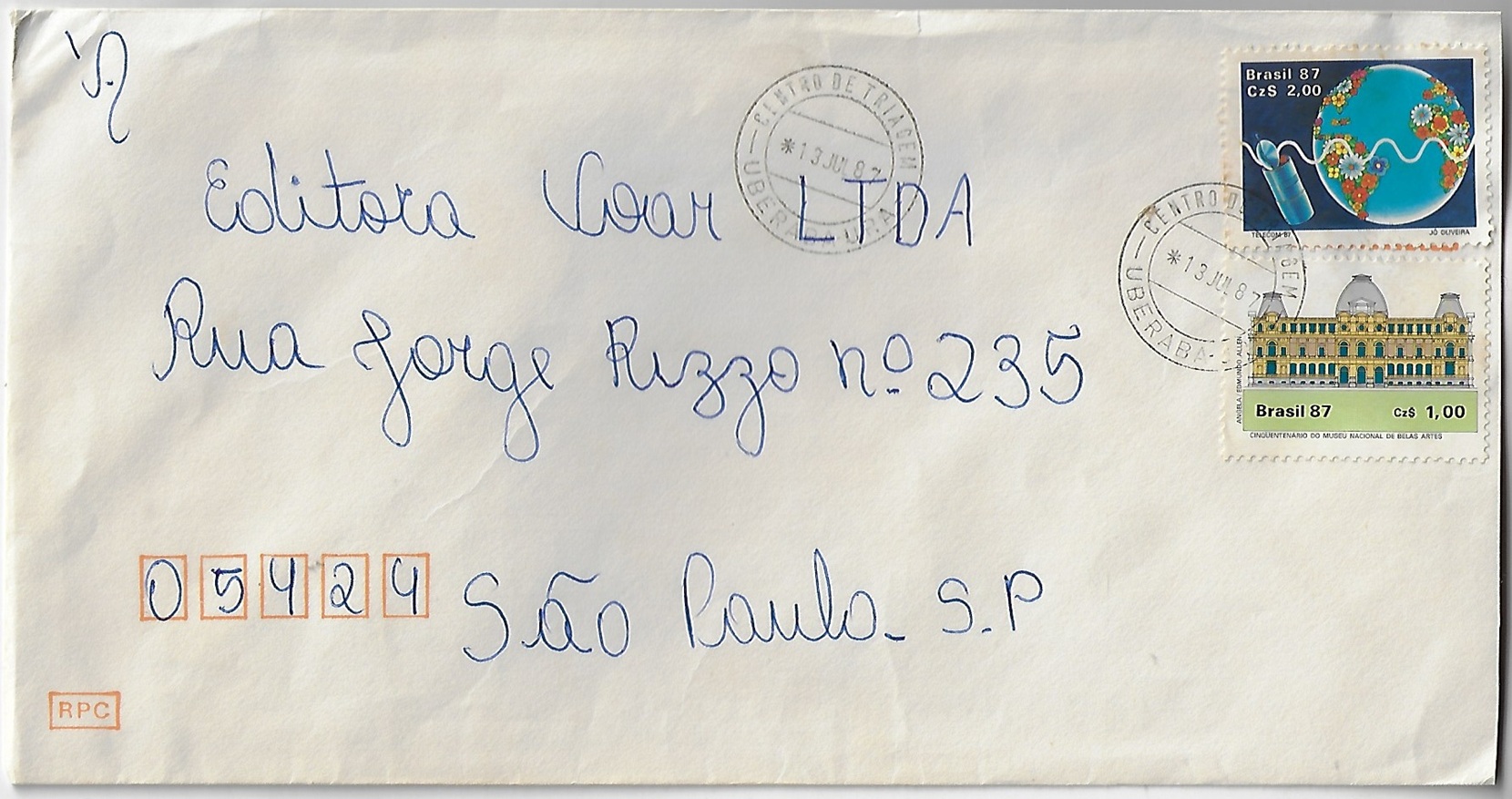 | 80884 | 2023, envelope prioritário registrado enviado de Biguaçu (21/11) para San Francisco / EUA, retornado ao remetente, marcas de triagem eletrônica na frente e no verso, 5 selos comemorativos 1ª Conferência Nacional da Juventure e 2 regulares Engraxate | 10,00 | Foto |