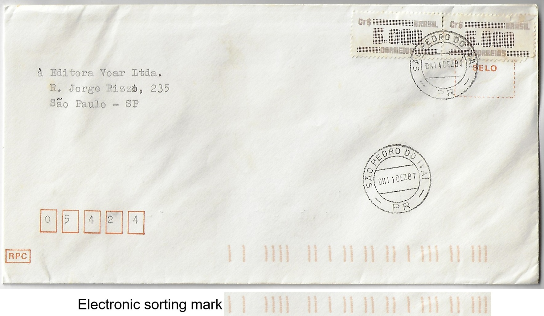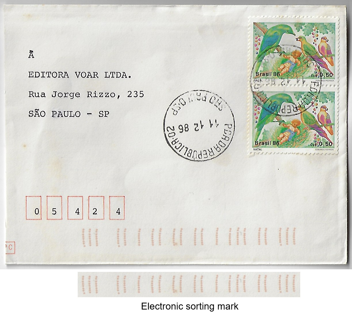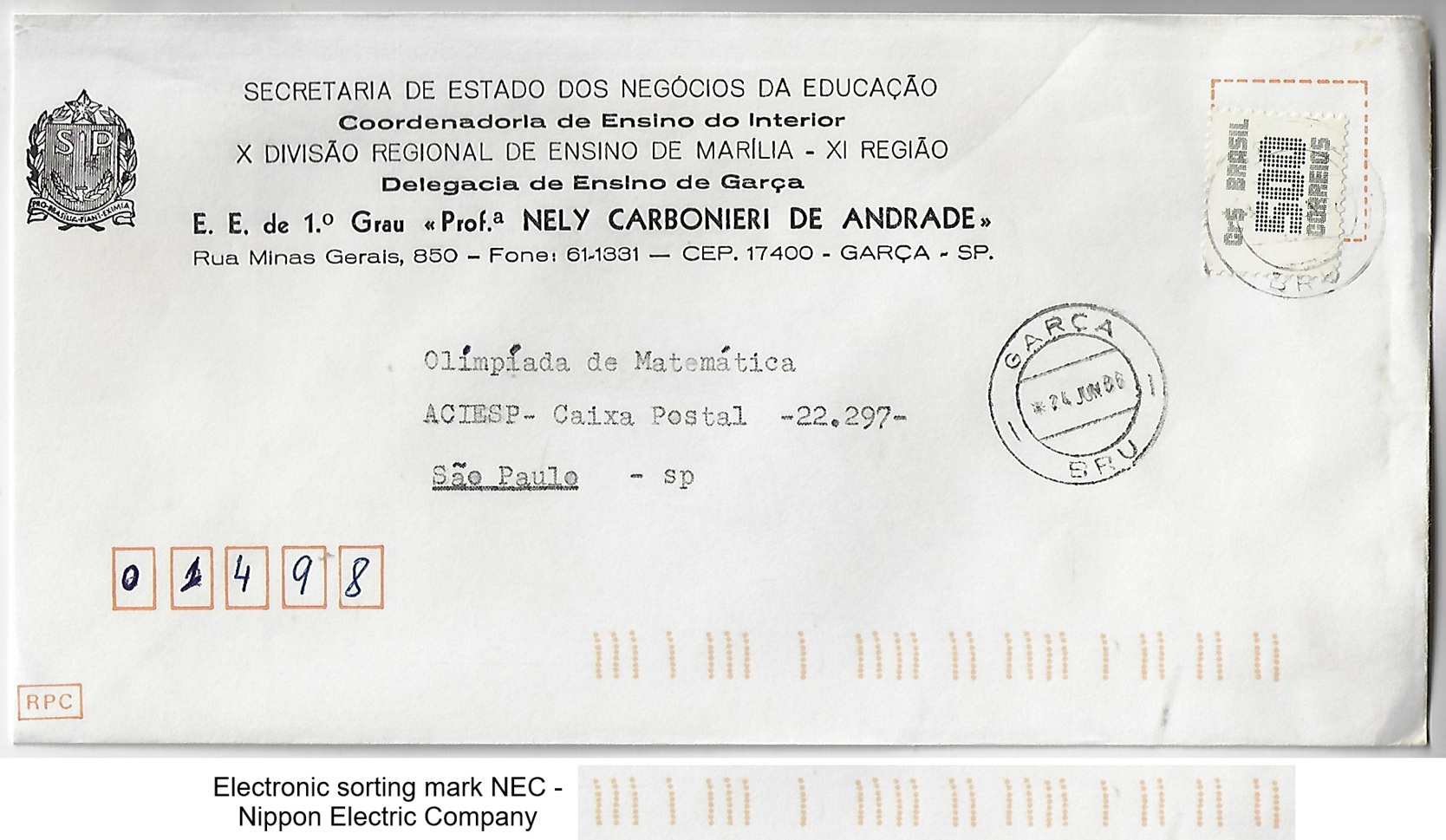 | 84782 | 2013, envelope janelado enviado de Itapevi, agência Nova Itapevi (16/2), porteado com selo Banco Postal, carimbo DH = Depois da Hora, marcas de triagem eletrônica do sistema NEC - Nippon Electric Company com postos de codificação ENSEC | 10,00 | Foto |