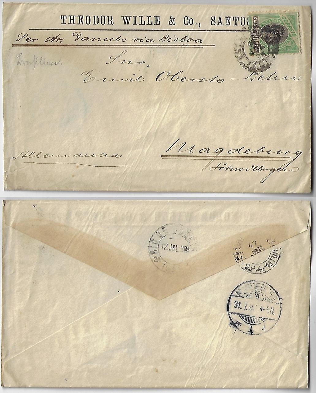 | 77204 | 1898, envelope comercial de Theodor Wille & Co. enviado de Santos (11/7) via São Paulo e Rio de Janeiro (12/7) para Magdeburg / Alemanha, transportado pelo navio Danube, da Royal Mail Steam Packet Co Ltd, porteado selo Madrugada Republicana 300 Réis | 75,00 | Foto |
