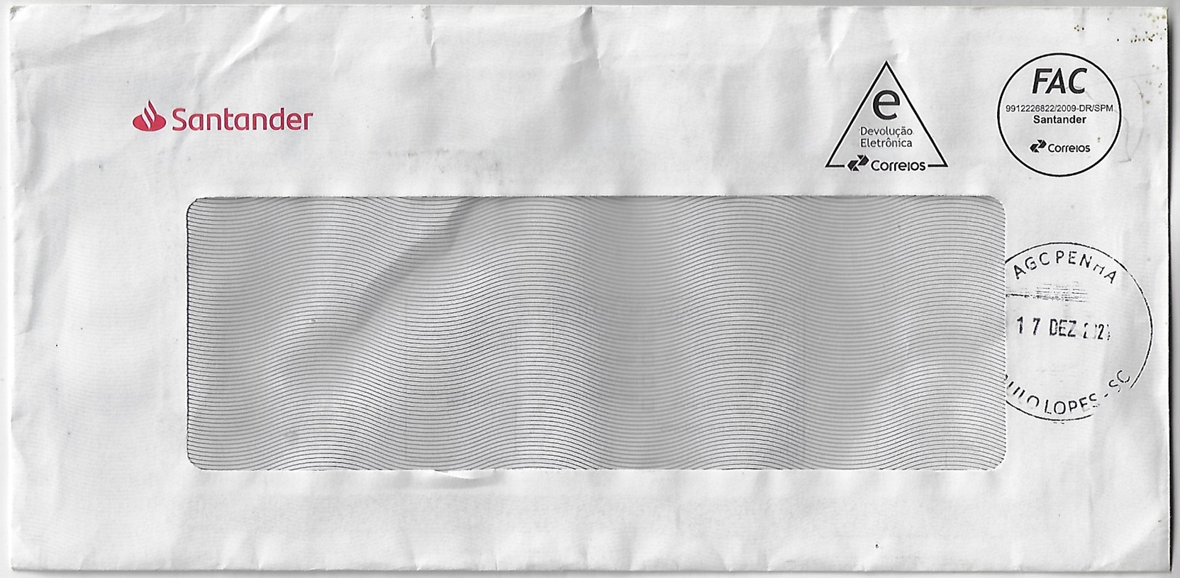 | 79620 | 2024, envelope postado como FAC - Franqueamento Autorizado de Cartas, com Devolução Eletrônica, contrato com Banco Santander, carimbo de Paulo Lopes, agência Penha (17/12) | 10,00 | Foto |