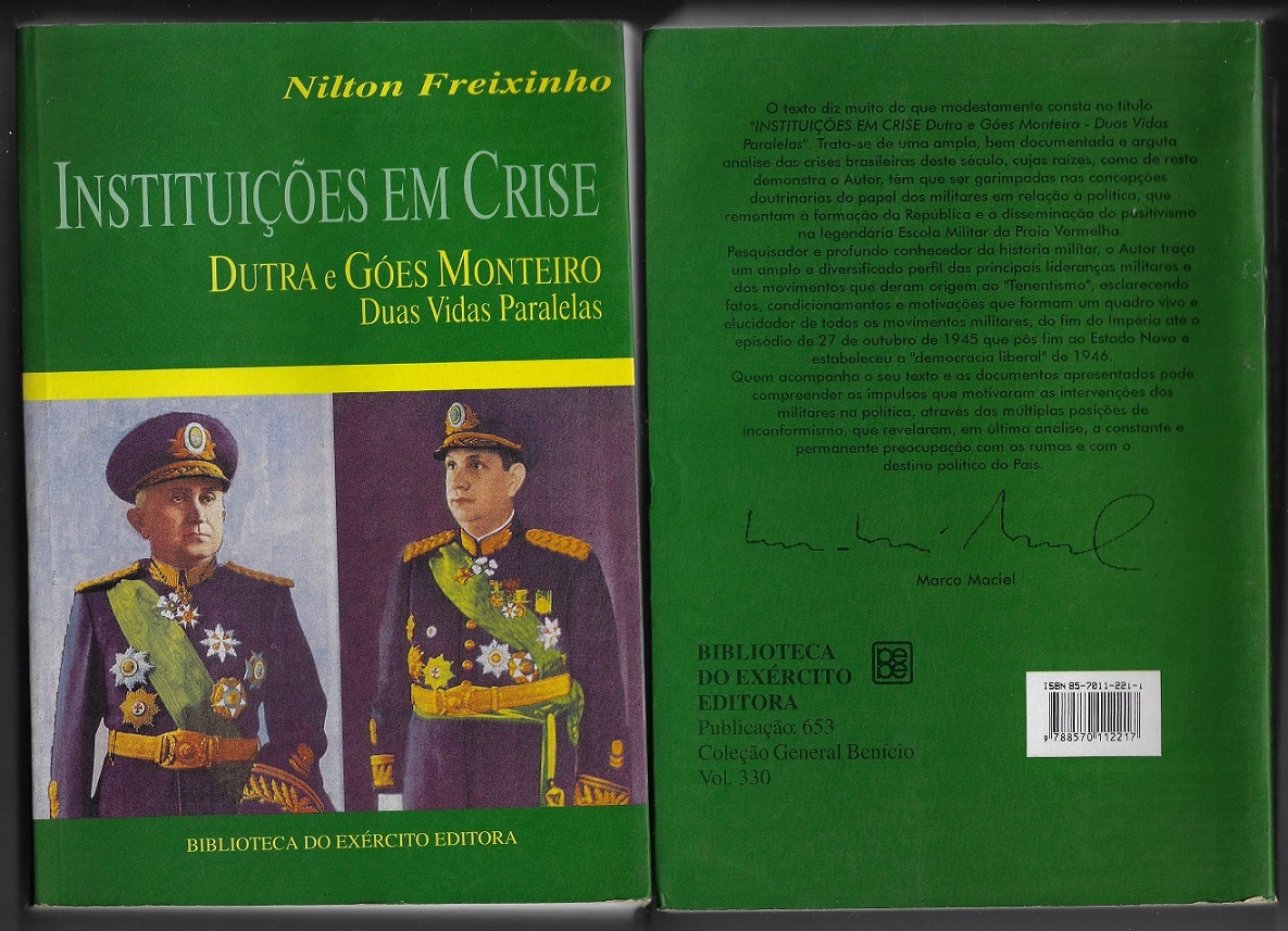 | 19220 | FREIXINHO, Nilton. "Instituições em Crise: Dutra e Góes Monteiro, Duas Vidas Paralelas", Editora Bibliex, 1997, 411 páginas, ótimo estado | 15,00 | Foto |