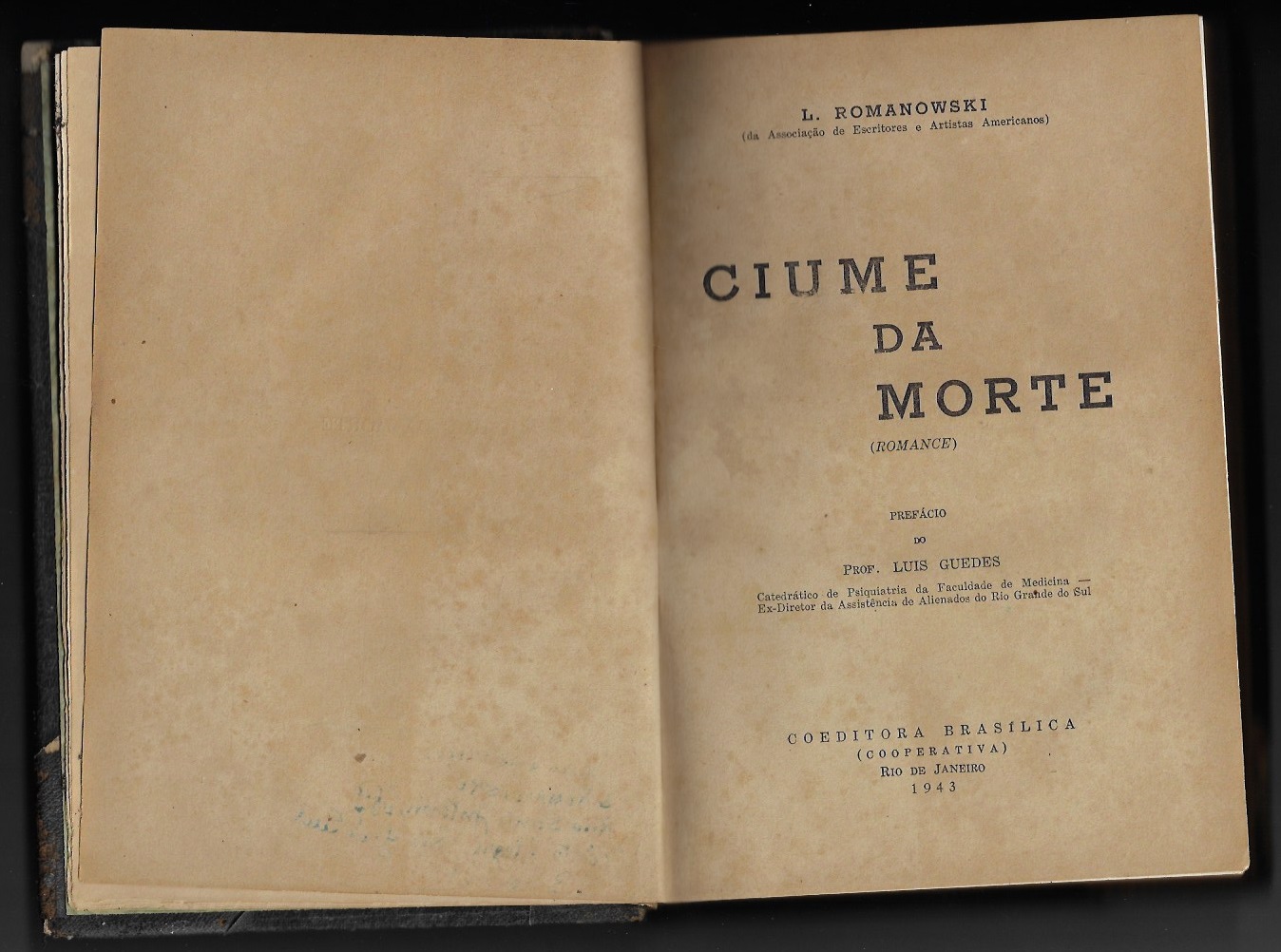 | 11753 | ROMANOWSKI, L. "Ciúme da Morte (romance)", Editora Brasílica, 1943, 296 páginas, com dedicatória do autor, alguns roídos na capa dura preta | 40,00 | Foto |