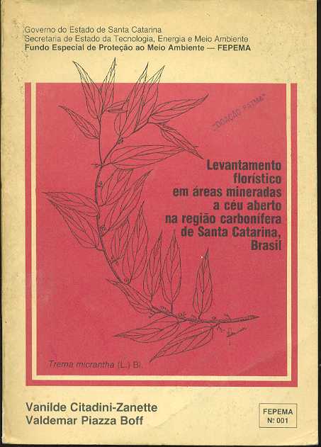 | 13613 | ZANETTE, Vanilde Citadine e BOFF, Valdemar Piazza. "Levantamento Florístico em áreas mineradas a céu aberto na região carbonífera de SC", Editora IOESC, 158 páginas ilustrado | 10,00 | Foto |