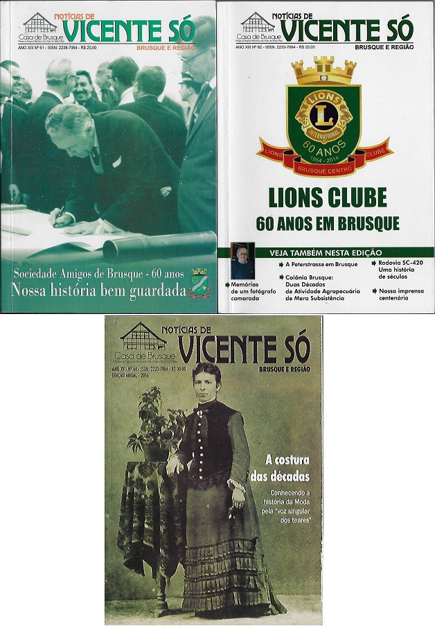 | 79914 | Sociedade Amigos de Brusque. “Notícias de Vicente Só”, nº 61, 62 e 64 (2013/2016), 112, 88 e 146 páginas | 20,00 | Foto |