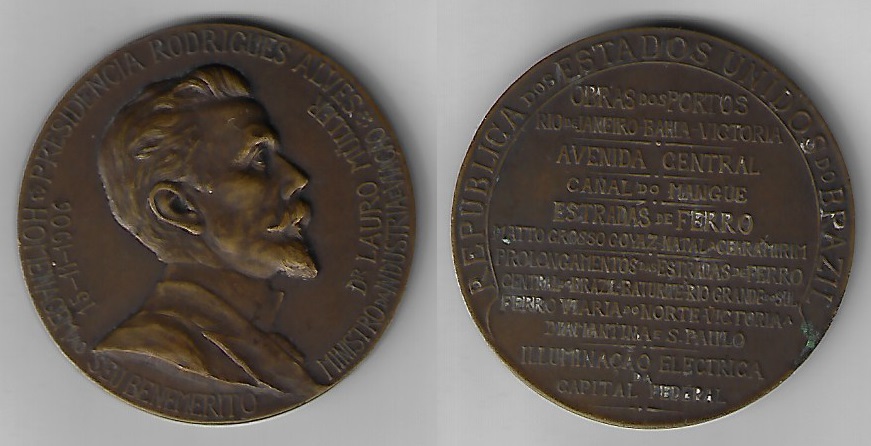| 66705 | Medalha, 1906, Homenagem do Presidente Rodrigues Alves ao Benemérito Dr. Lauro Müller, Bronze, Ø 50 mm, 56 gramas, gravador Girardet, MBC | 150,00 | Foto |