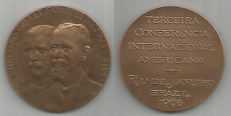 | 70712 | Medalha, 1906, alusiva a 3ª Conferência Internacional Americana, figurando os Presidentes Theodor Roosevelt e Rodrigues Alves, Bronze, Ø 45 mm, MBC | 100,00 | Foto |