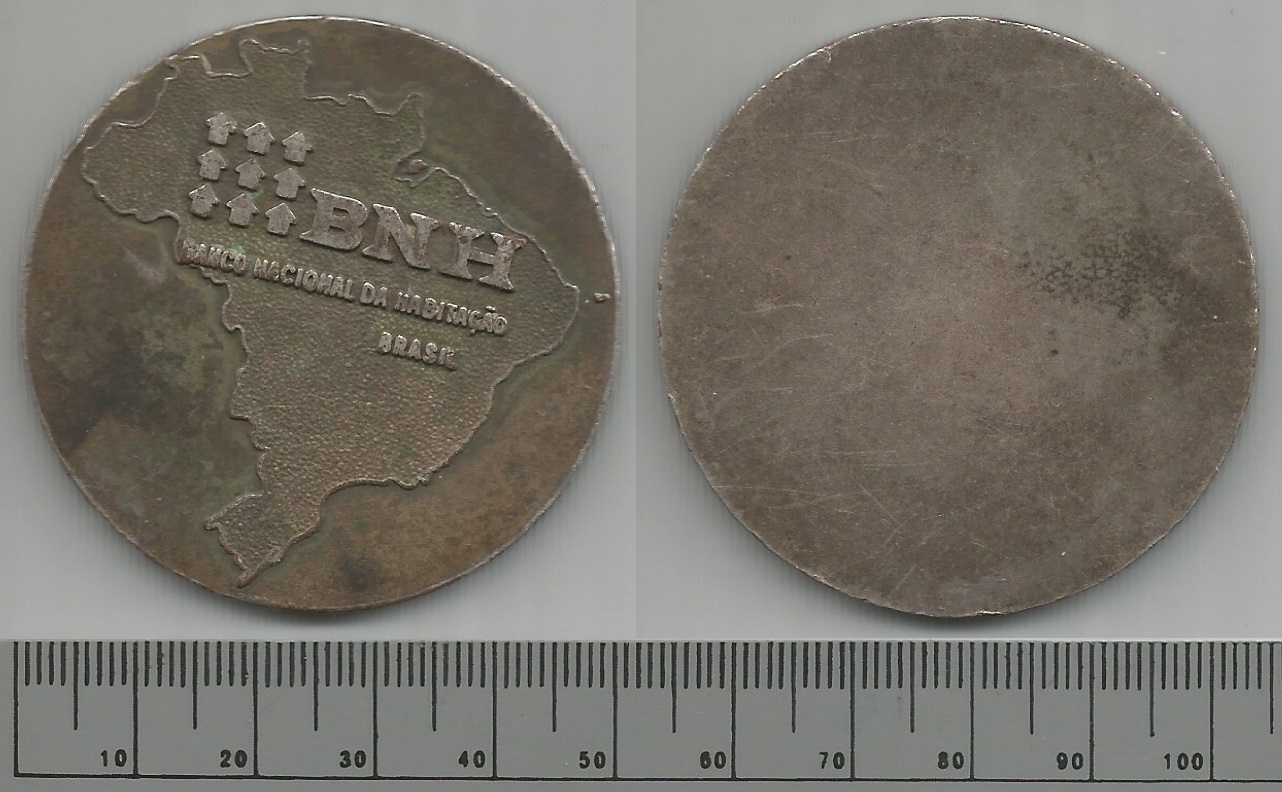 | 73827 | Medalha, 19??, BNH - Banco Nacional de Habitação, Níquel, Ø 50 mm, unifacial, MBC | 50,00 | Foto |