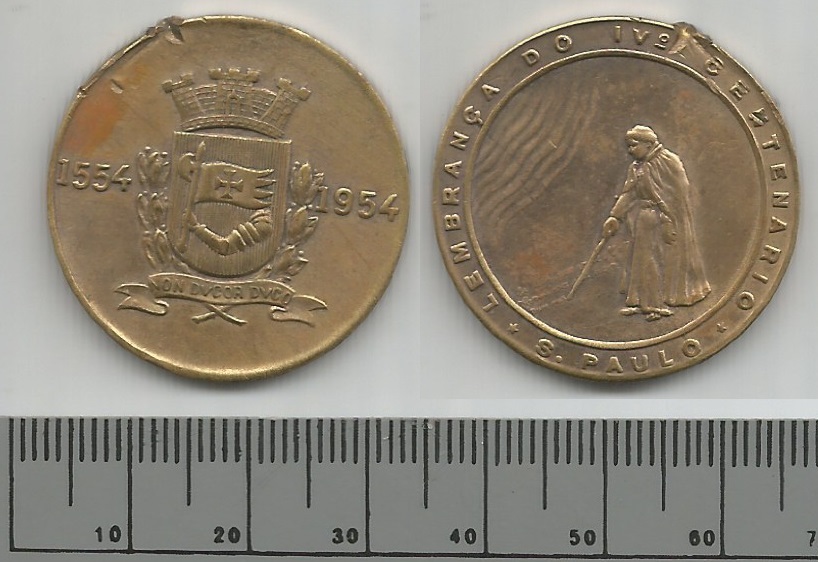 | 73831 | Medalha, 1954, 4º Centenário da Fundação de São Paulo - Padre Anchieta na Praia, Bronze, Ø 30 mm, com olhal quebrado, MBC | 30,00 | Foto |
