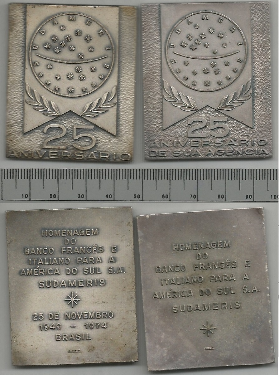 | 73842 | Medalha, 1974, 25º Aniversário do Banco Sudameris, Níquel, 45x55 mm, Esmaltarte, 2 tipos diferentes, Soberba | 60,00 | Foto |