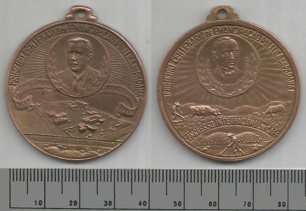 | 73856 | Medalha, 1953, 1º Centenário de Emancipação Política do Paraná - Congresso Internacional de Café, Bronze Dourado, Ø 40 mm, com olhal, FC | 40,00 | Foto |