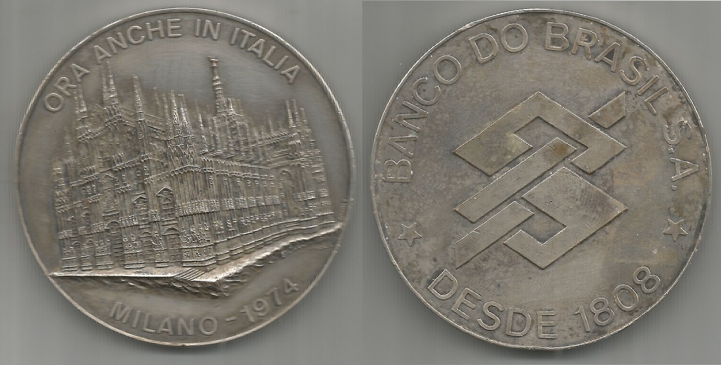 | 78247 | Medalha, 1974, alusiva ao Banco do Brasil - desde 1808 - Ora Anche In Italia - Milano, 125 gramas de bronze prateado, Ø 63 mm, gravador Eberle / Segalla, Soberba | 120,00 | Foto |