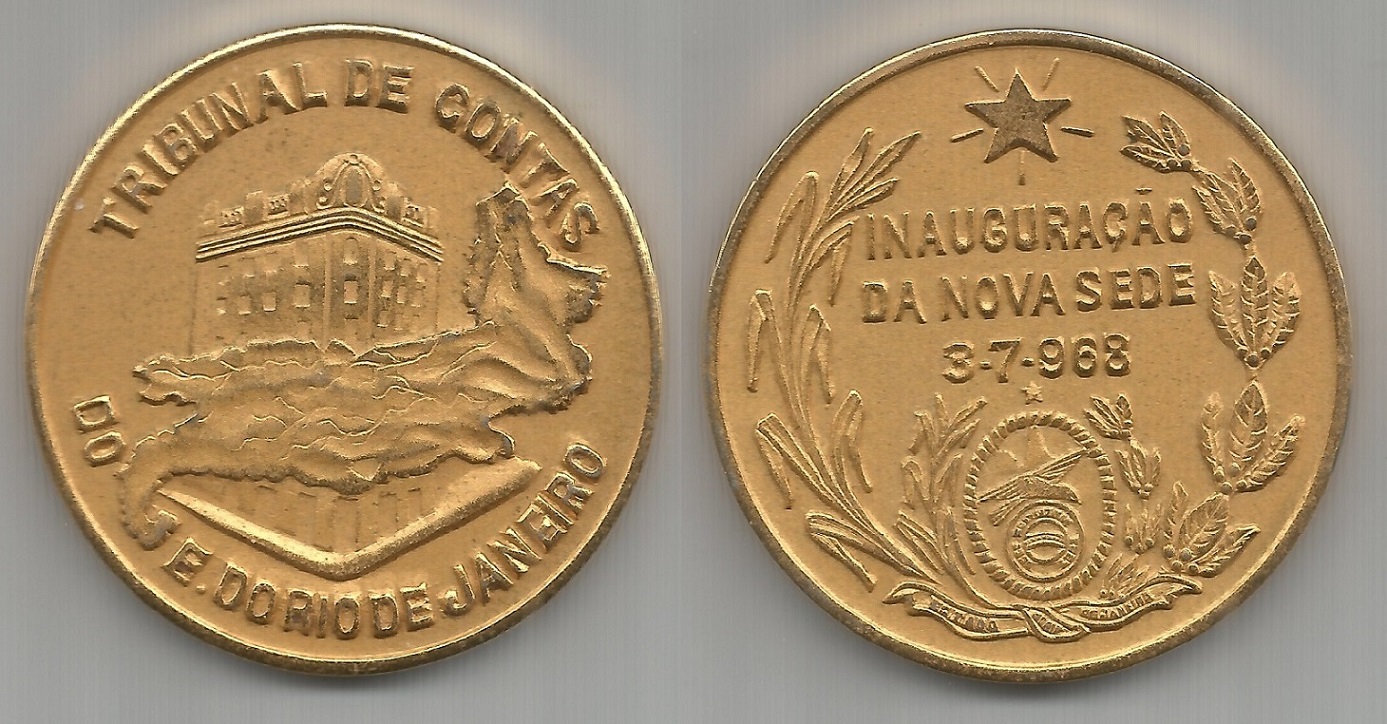 | 78251 | Medalha, 1968, Inauguração da Nova Sede do Tribunal de Contas do Estado do Rio de Janeiro, 40 gramas de Bronze Dourado, Ø 44 mm, FC | 44,00 | Foto |