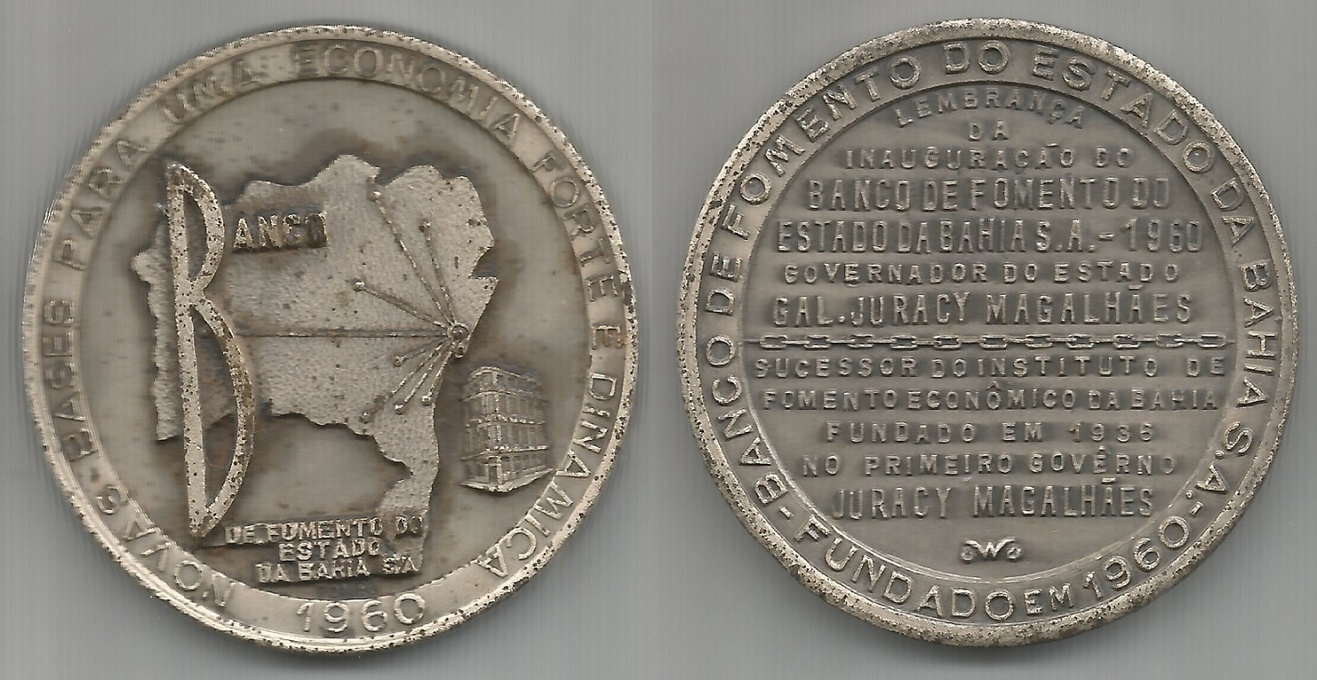 | 78252 | Medalha, 1960, Banco de Fomento do Estado da Bahia, 42 gramas, Bronze Prateado, Ø 45 mm, gravador Pombo, FC | 45,00 | Foto |