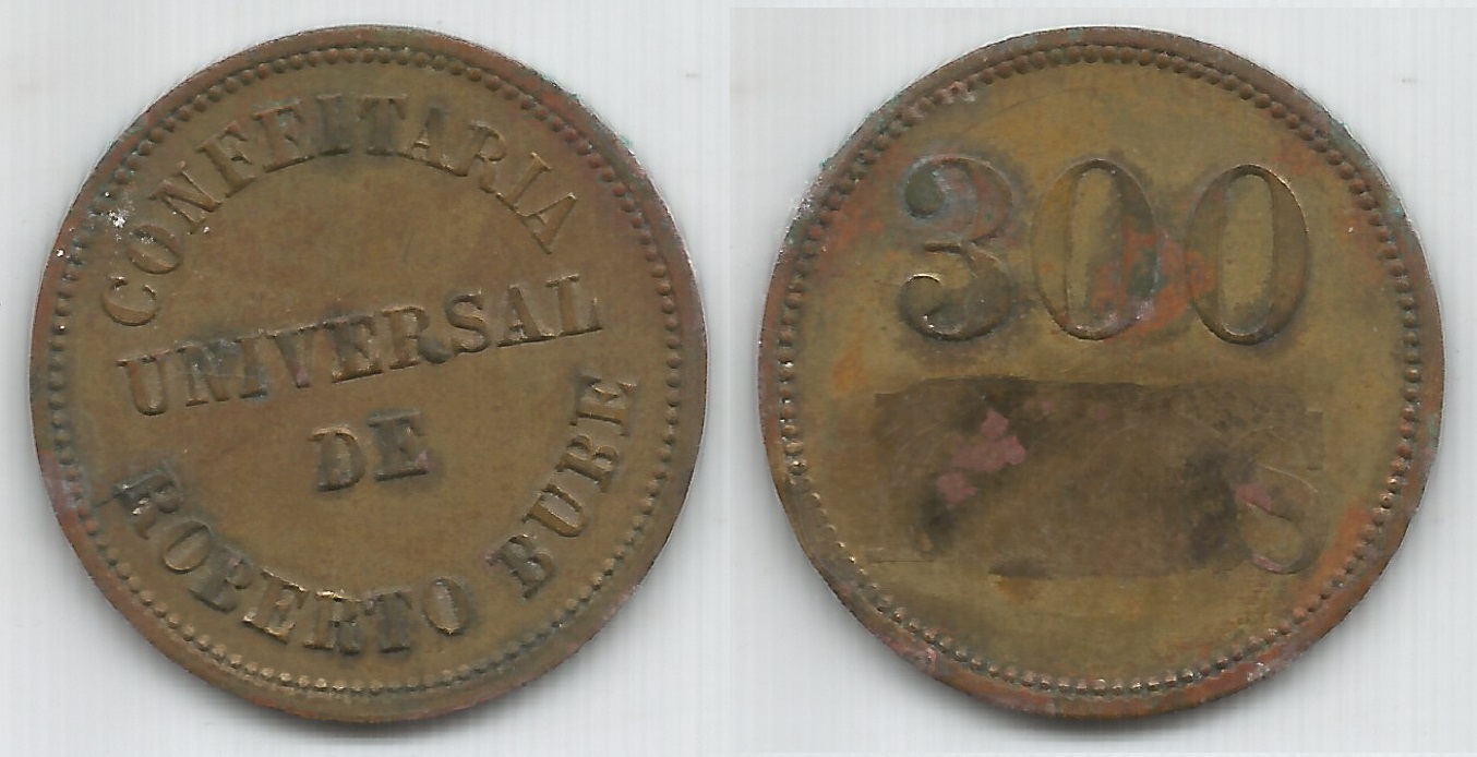 | 78255 | Ficha, 1930s, Confeitaria Universal de Roberto Bube, de Curitiba, facial "300", 4,3 gramas, Bronze, Ø 25 mm, MBC | 100,00 | Foto |