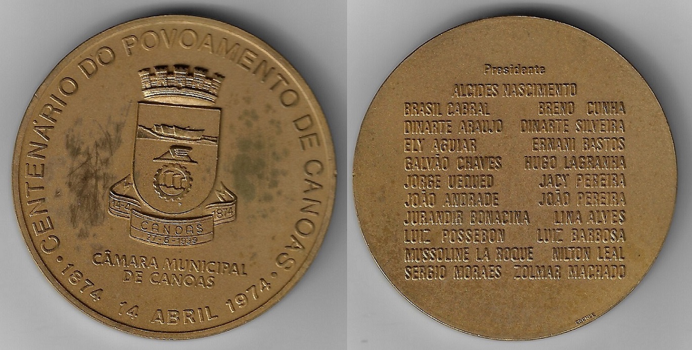 | 78771 | Medalha, 1974, alusiva ao Centenário do povoamento de Canoas, 75 gramas de Bronze, Ø 51 mm, Soberba | 60,00 | Foto |